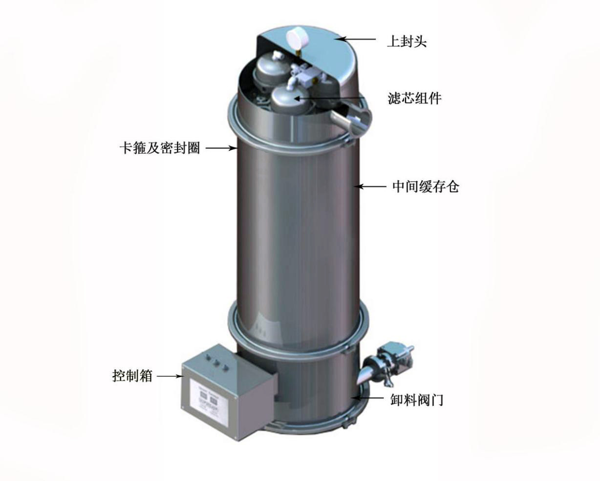 我公司真空吸料机的主体结构见图1所示,包含上封头、滤芯组件、中间缓存仓、卸料阀门、控制箱和卡箍及密封圈六部分组成。