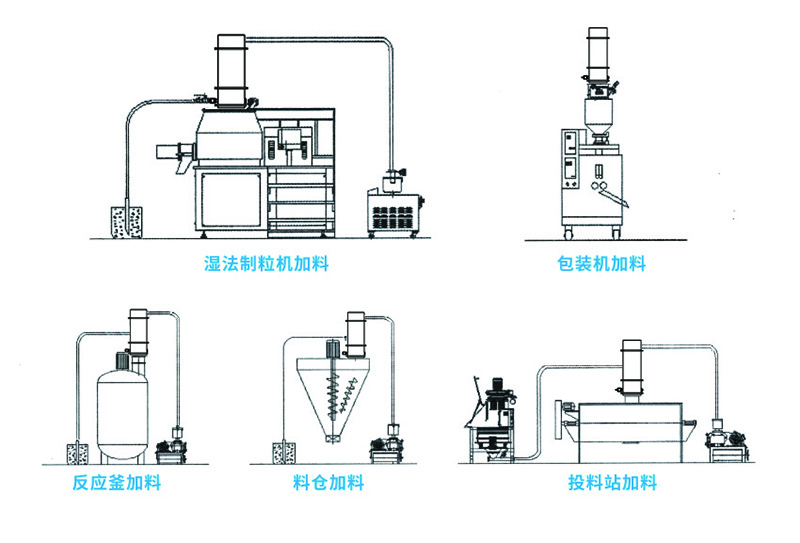 适用于医药、食品、化工、电池等行业中的粉末、颗粒状散装物料的输送,可用于反应釜、压片机、胶囊填充机、湿法制粒机、包装机、粉碎机、振动筛等设备自动上料。