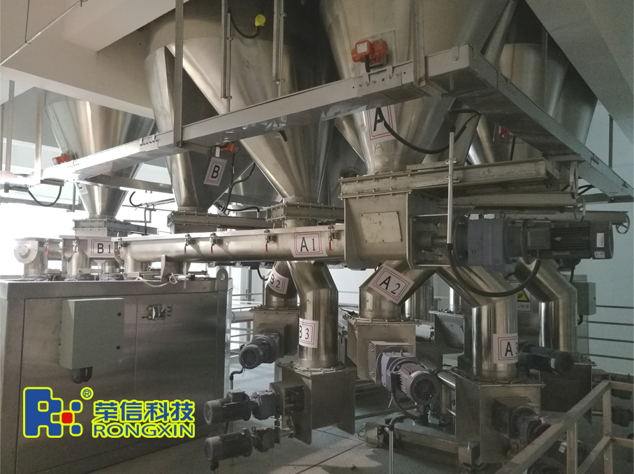 该系统主要由自动上料系统、自动计量系统、自动输送系统等部分组成。配料系统共设计10个料仓,储料仓上料形式根据物料不同可以采用气力输送上料或者提升机上料。料仓下方设有料斗秤,用于该种物料的自动称量,称量完成后通过转运车转运或者直接卸料至配料罐。整个配料过程全封闭。